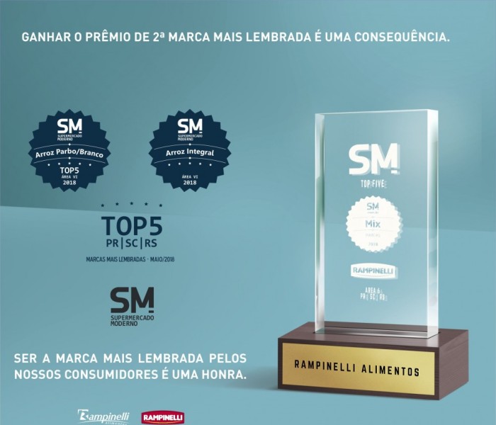 O Arroz Rampinelli foi a 2ª marca de arroz (Parbo e Branco) mais lembrada na categoria ‘’Mercearia de alto Giro’’ no Mix Marcas TOP FIVE 2018 da conceituada Revista Supermercado Moderno em todo território nacional. Uma posição de respeito, comprovando que os consumidores confiam na qualidade dos nossos produtos. Agradecemos e compartilhamos mais essa conquista com todos os nossos consumidores.Temos certeza de que no próximo ano iremos além.