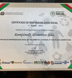 A Assembleia Legislativa de Santa Catarina concedeu o Certificado de Responsabilidade Social de Santa Catarina à Rampinelli Alimentos, com base na Lei 12.918, de 23 de janeiro de 2004. A certificação tem o objetivo de reconhecer e destacar as empresas privadas, empresas públicas e organizações sem fins lucrativos com atuação em território catarinense que tenham a responsabilidade socioambiental incluída em suas políticas de gestão.