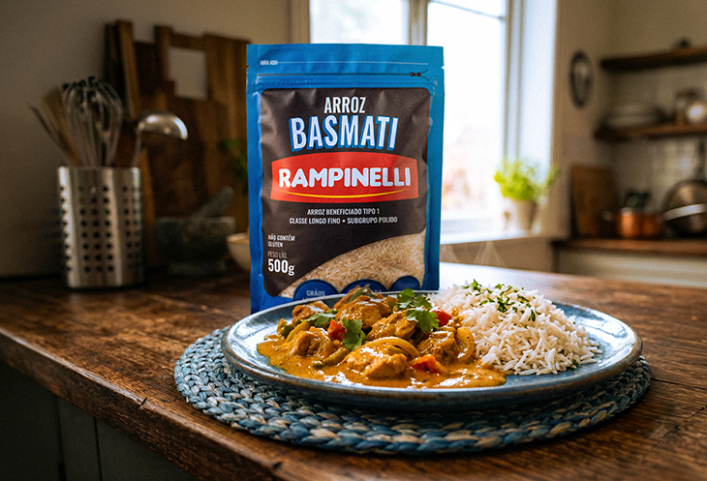 - 08 Sirva o frango ao curry sobre o Arroz Basmati Rampinelli ainda quente.